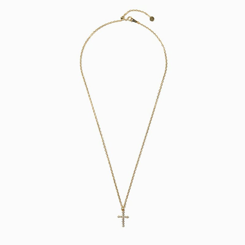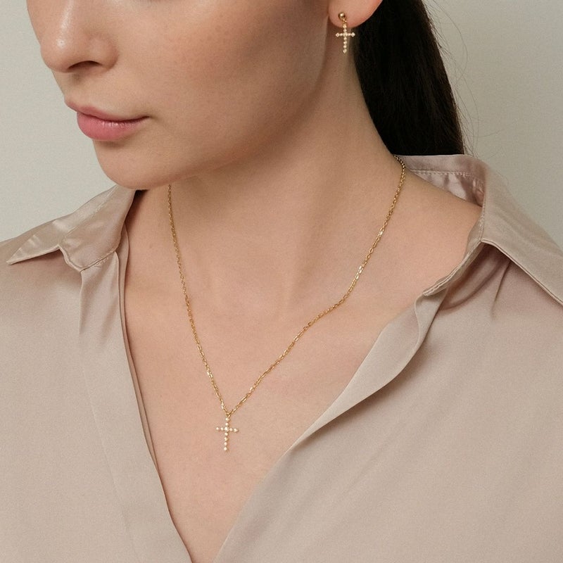 力強い印象のクロス(十字架)モチーフをストーンで描くことで繊細さと優美を表現し男女問わず身に着けやすいデザインに。
