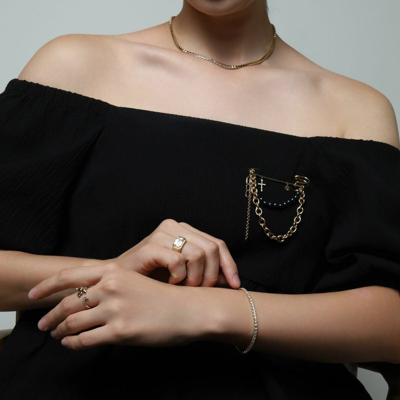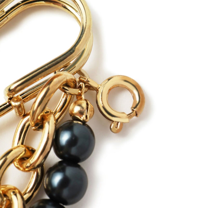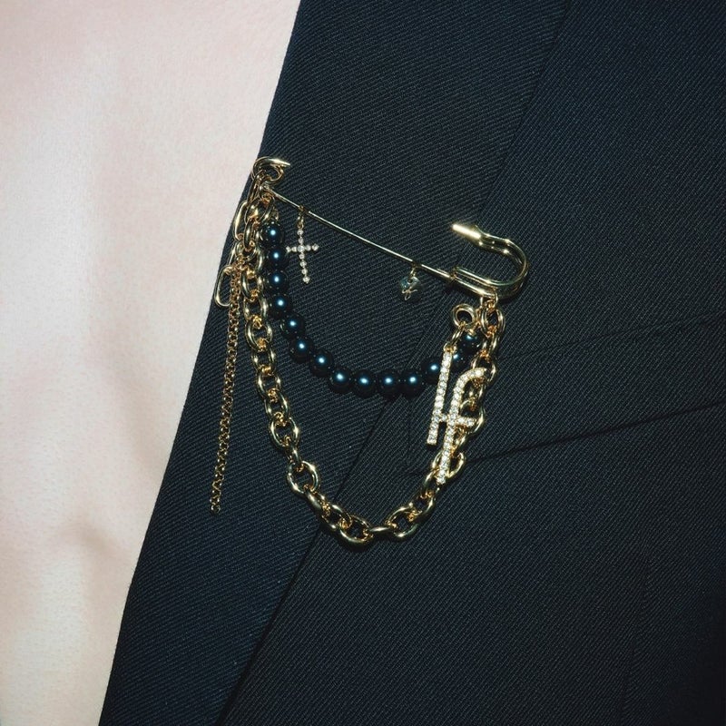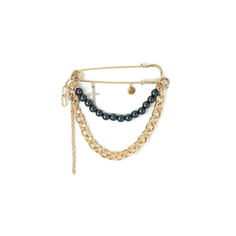 過去のコレクションで使用したブラックパール、チェーン、クロスモチーフをミックスしデザインされたブローチ。