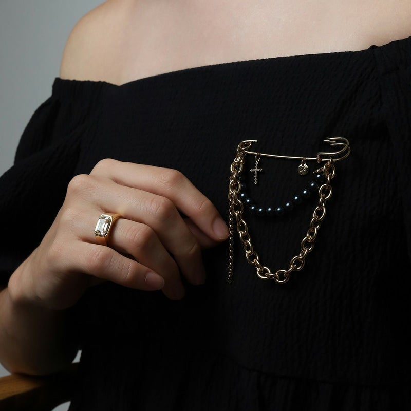 パールやチェーンの揺れ感で存在感がでるブローチはジャケットにはもちろん、ストールや帽子、バッグなどに付けてお楽しみいただけます。